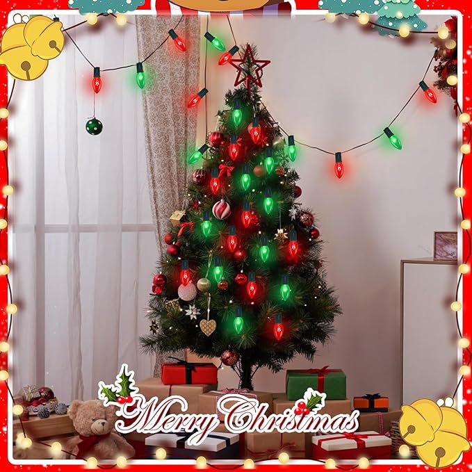 - Energy-Efficient Festive Lighting: Light up your holiday season with these vibrant clear red and green Christmas lights. Designed with E17/C9 candelabra socket bases for easy end-to-end connectivity, red and green outdoor christmas lights cover up to 25 feet with minimal effort. With each bulb operating at 7 watts and 120 volts, you'll enjoy brilliant illumination while keeping your energy costs down.