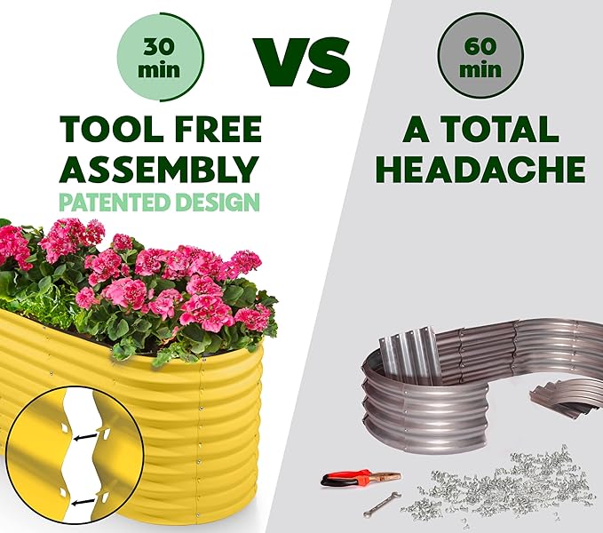 - EFFORTLESS ASSEMBLY, LIKE NO OTHER! Begin your planting journey by choosing our innovative patented design, featuring the perfect combination of easy assembly and durability. Thanks to our unique tool-free design, assembly is a breeze and can be completed in just 30 minutes! Get started on your garden right away and enjoy fresh, healthy produce in no time.