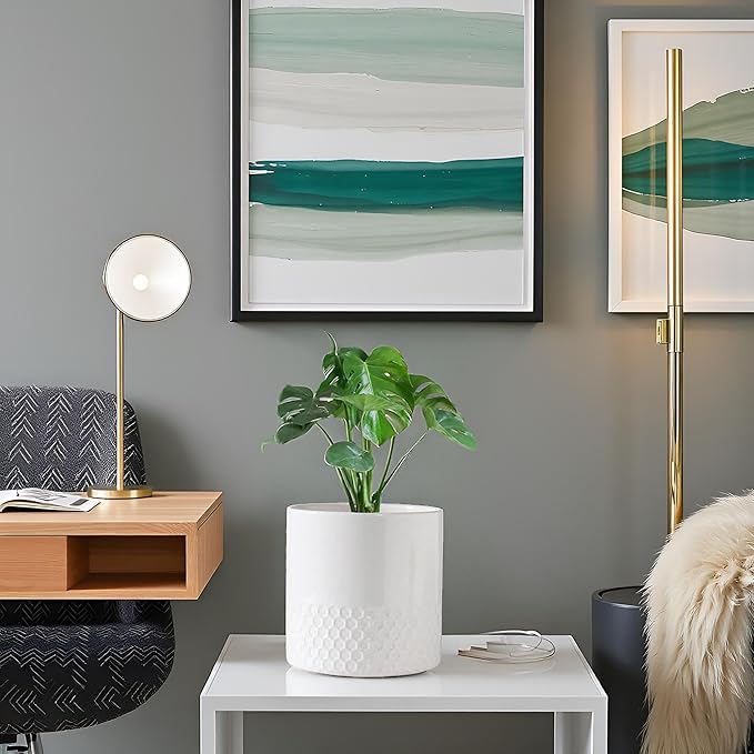 Docrin Ceramic Planters Indoor, 8 Inch Plant Pots with Drainage Holes for Home/Office - White Honeycomb