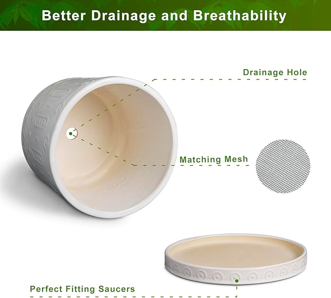 - Optimal Drainage: The plant pots with drainage holes and saucers ensures high and well water flow and air circulation, keeping your plants healthy while preventing excess water from spilling and staining your surfaces