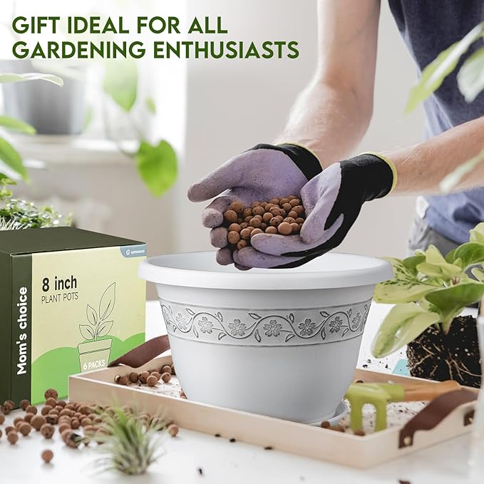 8 Inch Plant Pots with Drainage Hole - Lightweight Flower Pots for Herbs and Flowers - Home Decor Plastic Planters for Indoor Outdoor Plants- Pack of 6 (White, 8 inch)