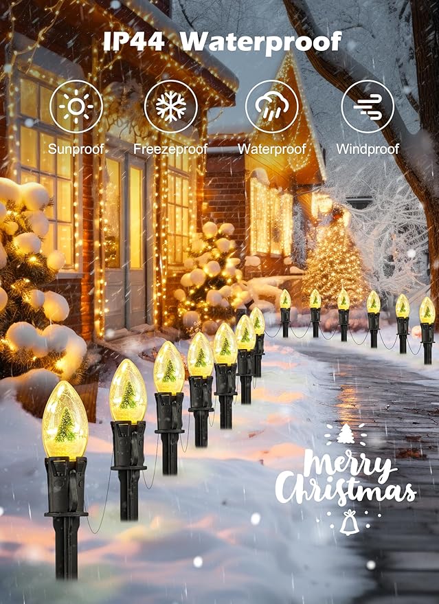 - C9 Christmas Pathway Lights with Stakes: These 45-foot C9 Christmas stake lights feature a classic design with 40 C9 LED bulbs,12-inch bulb spacing. Each bulb contains a mini Christmas tree, foam snowflakes, and five warm white LED beads, creating a festive glow. Includes 40 sturdy black stakes, perfect for holiday garden décor