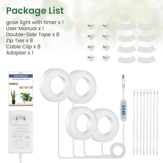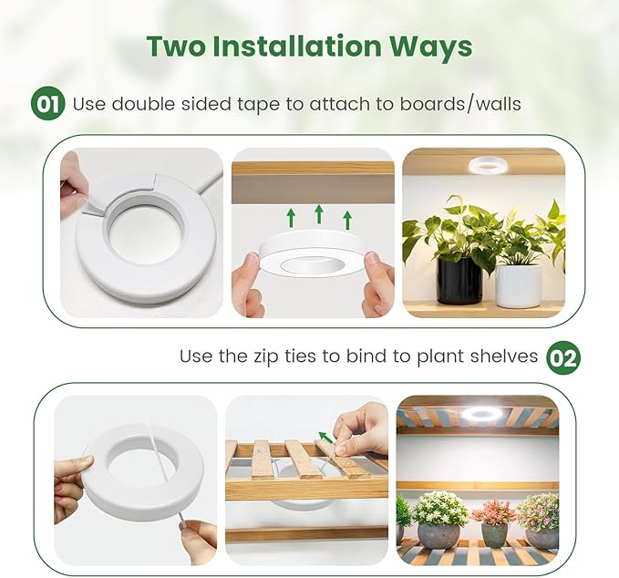 - Two Installation Methods: Effortlessly install the plant lamp using the included zip ties, and strong double-sided tape, and it also comes with wire clips for a secure and tidy setup. Create a thriving indoor garden with this versatile plant grow light.