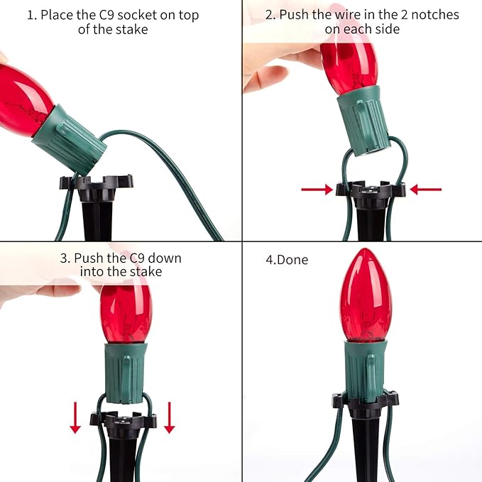 - 4 Pack 20 Multicolor C9 Pathway String Lights: Traditional 25.7 Feet 20 Clear lights strands with 15 inches spacing, 20 Stakes, 3.9 inches anchor spike, E17 holder compatible, plug in and enjoy it. It is also an exquisite gift for friends, families or relatives too