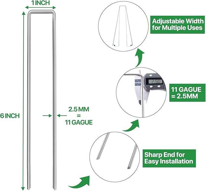 - Rust-Resistant Galvanized : These landscape staples are galvanized to resist rust and corrosion, offering long-lasting performance in all weather conditions. Trust these landscaping stakes to stay strong and reliable season after season.