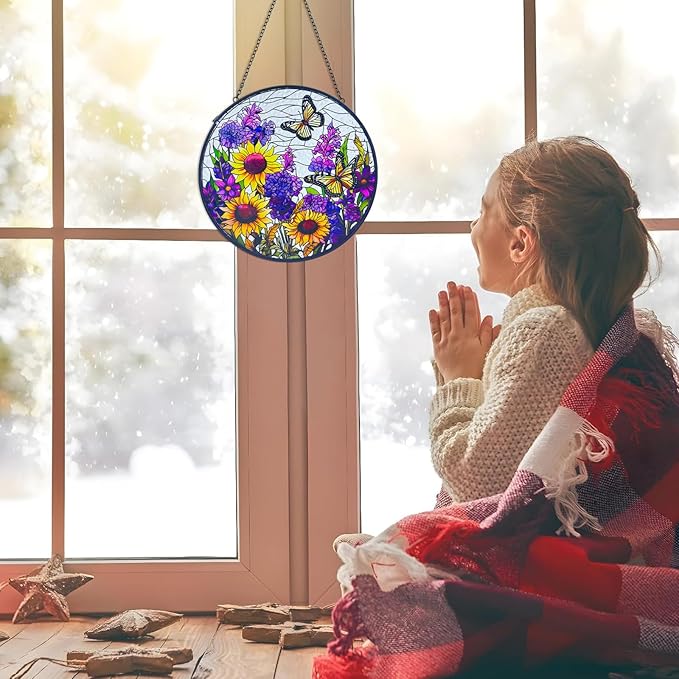 Butterfly Sunflower Stained Glass Suncatchers - Handcrafted Round Glass Art for Windows & Doors Décor - Decoration for Home Garden Christmas Party Wedding Housewarming Gifts