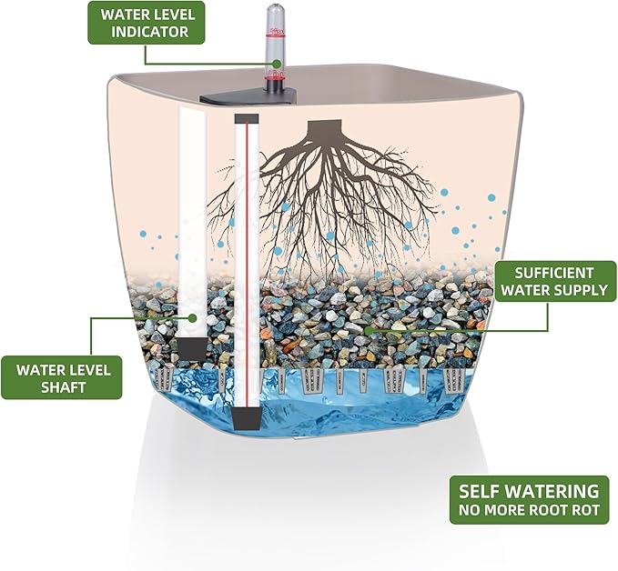 - SELF WATERING & NO MORE ROOT ROT - The smart unique sub-irrigation system is one of the most appealing aspects among all Dexceder planters. The easy-to-use separated integrated water reservoir or catcher- keeps your soil well aerated and automatic supplies plants with the right amount of ongoing moist air & nutrition for optimal growth. The insert indicator shows you the exact time to water again. The full water supply period can single-handedly last over 3 weeks based on different live plants