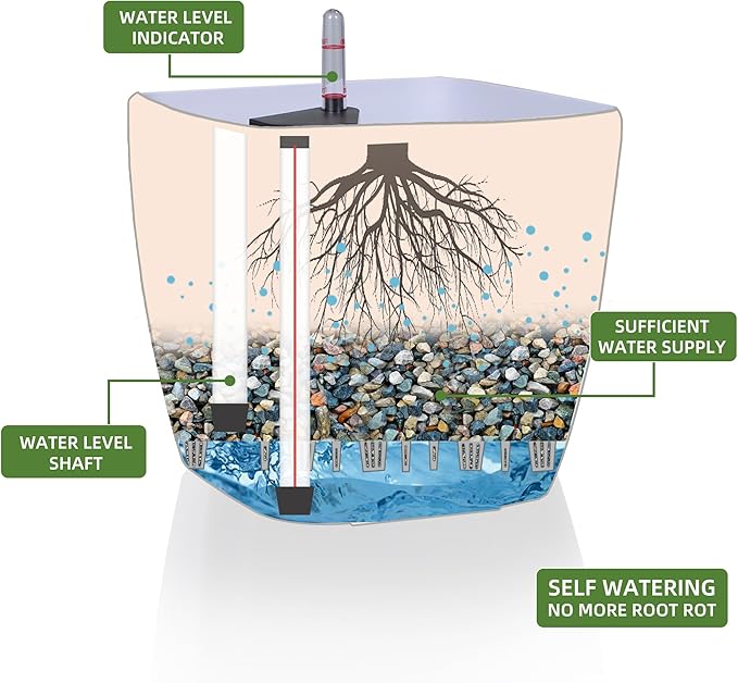 - NEVER MISS WATERING AGAIN - The hydroponic device keeps water ready, then watering time is at your discretion on the gauge. The design of drainage plug and spillway hole is to avoid cycles of overwatering and underwatering, pull out the plug to drain the excess water on rainy days outdoors. The sufficient water supply system enables double the water-efficient than conventional pots. Don't be anxious about missing watering while you enjoy a long term holiday on a journey or travel outside