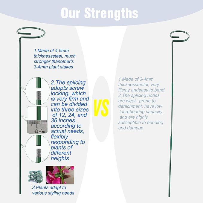 - Upgraded Thickened Plant Support Pole : plant support pole thickened, diameter 4.5 mm, threaded rotary powerful combination, sturdy and durable; carbon steel material, plant support pole surface is treated with anti-rust treatment, rustproof/won't break/split/burn off, provides strong reusable. Smooth and flat surface, won't prick your fingers.