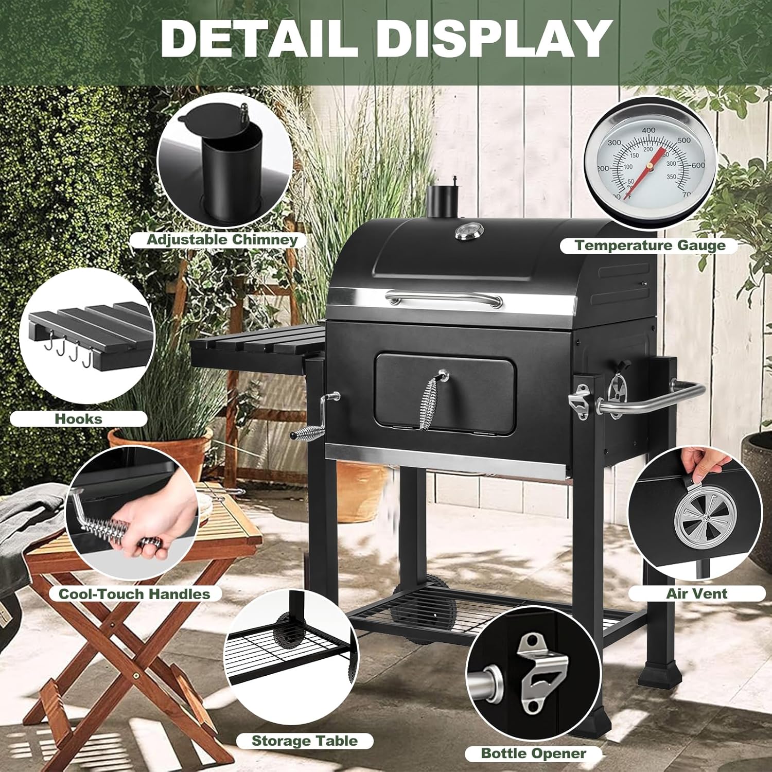 - Durable Steel Construction with Storage Shelf: Built with a strong steel frame and finished with a high-temperature coating, this grill is made to last. The bottom storage shelf is perfect for holding charcoal bags, tools, or condiments, making it a functional and organized grilling companion.