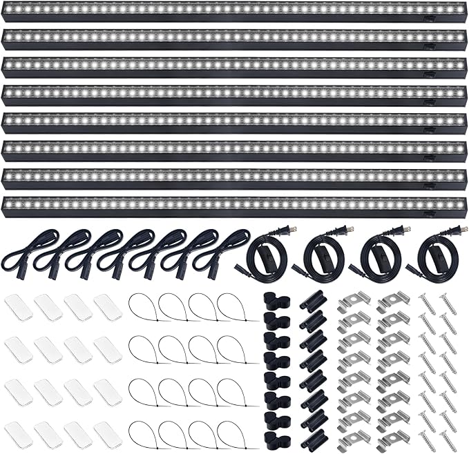 - What You Get: 8 x Barrina T5 Grow Lights, 4 x Power Cords with ON/OFF Switch, 7 x Connecting Cords (20''), 8 x Small Connectors, 16 x Installation Clips, 16 x Magnetic Bars with Double-Sided Tape, 16x Cable Ties, 8 x Dustproof Cap