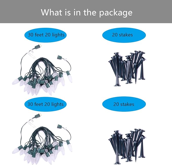 - 2 Pack C9 White LED Pathway Lights - MAINDECO C9 Christmas walkway lights are 30 feet long in total which contain 20 White C9 LED SMD strawberry faceted bulbs with 18 inches spacing, 20 Stakes, E17 base sockets. After installing the ground stakes, it can be fixed in the ground to add Christmas holiday lights to your yard, garden and pathway, etc.