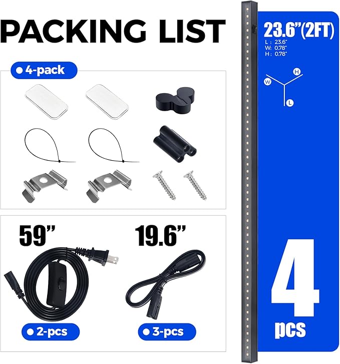 - What You Get: 4 x Barrina T5 Grow Lights, 2 x Power Cords with ON/OFF Switch, 3 x Connecting Cords (20''), 4 x Small Connectors, 8 x Installation Clips, 8 x Magnetic Bars with Double-Sided Tape, 8 x Cable Ties, 4 x Dustproof Cap