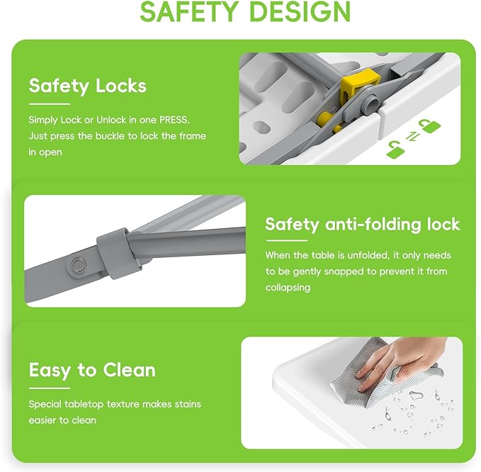 - Safe & Secure Design: Equipped with both a triangular bracket anti-folding lock and a safety lock on the back of the table top, this foldable table provides added safety and security during use