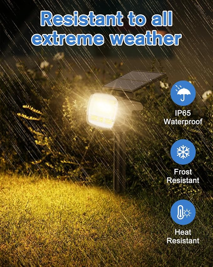 - 【Highly Efficient Charging】The outdoor solar lights for yard has the latest solar panels which can easily reach 30% energy conversion, and both spot lights' stick and solar panel can be rotated 120° for efficient energy conversion.