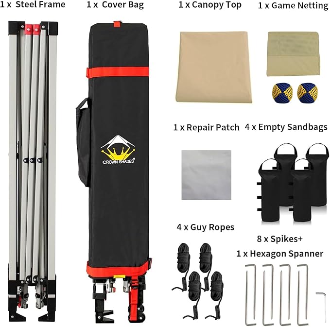 CROWN SHADES 10x10 Pop Up Canopy Tent with Game Netting - Beach Tent with One Push Setup - Outdoor Sun Shade for Events, Parties, Camping with STO-N-Go Cover Bag, Silver Coated Top, Khaki
