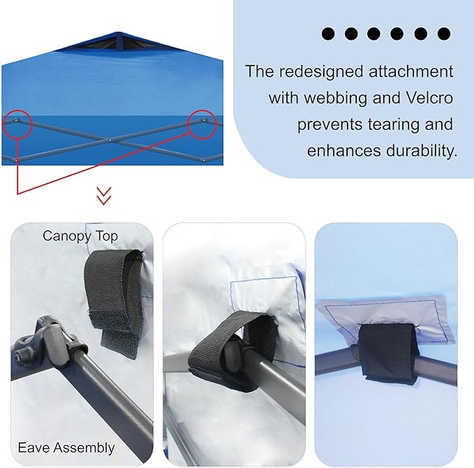 - HIGH GRADE STEEL FRAME - The durable, high-grade, corrosion-resistant steel truss frame with hardened through bolts comes pre-assembled and can be set up without any tools. Engineered to support up to 120 lbs. distributed across the frame, it ensures robust and reliable performance. The extended ceiling assembly and upgraded high peak design make it easier for rainwater to run off, preventing water pooling on the canopy. Perfect for extended outdoor use at markets, festivals, and exhibitions.