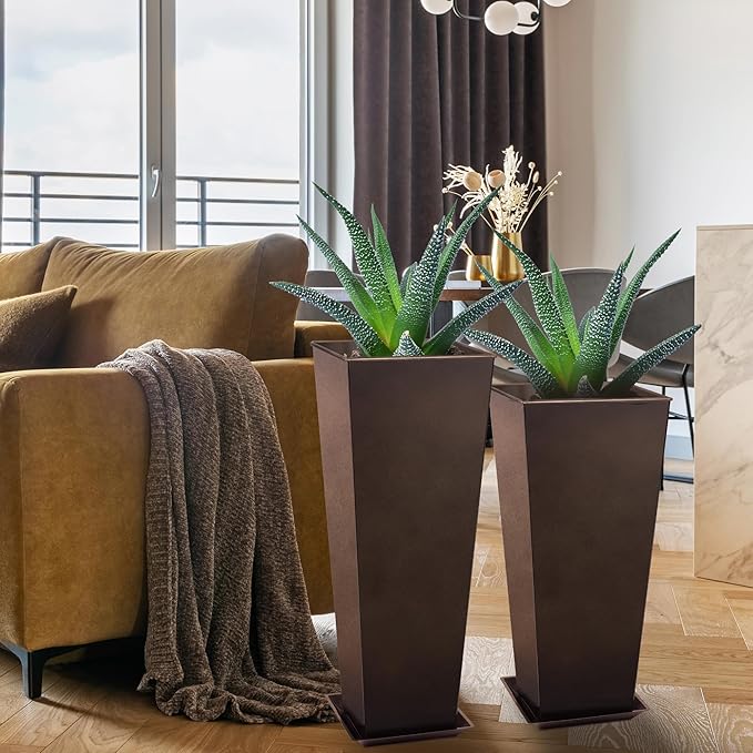 KOL 25'' & 28'' Tall Galvanized Steel Planter with Saucer, Metal Planter Pots for Indoor & Outdoor Use, Decorative Flower Plant Pots with Drainage Hole for Front Porch, Patio, Deck - Rust Color