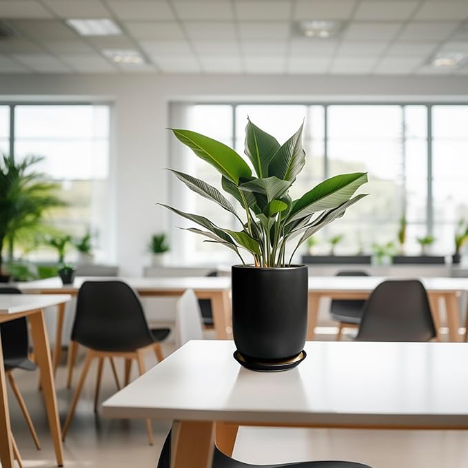 Ceramic Planter 8 Inch - Plant Pot for Indoor Outdoor Plants Cylinder Flower Pot with Drainage Hole and Saucer Black
