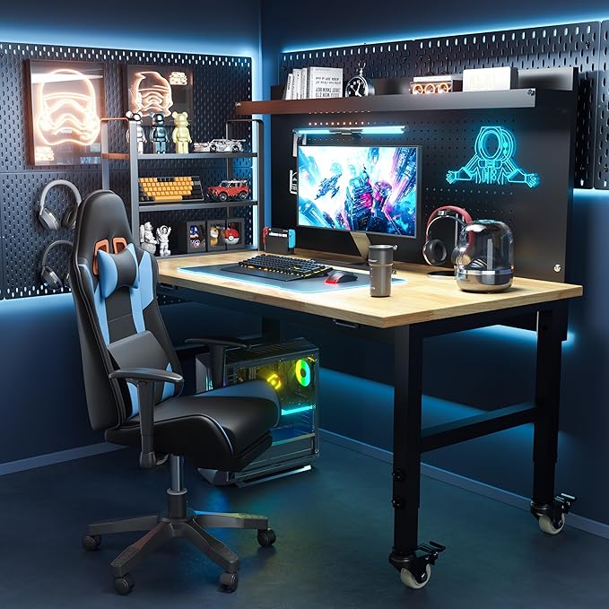 48" Heavy Duty Adjustable Workbench with Large Pegboard, Adjustable Work Table with Power Outlets & Lockable Wheels, Rubber Wood Workstation for Garage, Workshop, Office, Home, Commercial