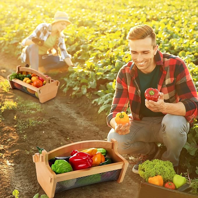 - Sturdy Construction: the garden hod harvest basket crafted from robust pine wood and rustproofed mesh wire bottom, exemplifies durability and longevity, ensuring it can withstand the weight of harvested produce and the rigors of agricultural use; Manually handcrafted to refine a smooth finished that boosts its natural appeal. Designed with quality in mind, the baskets are large and sturdy