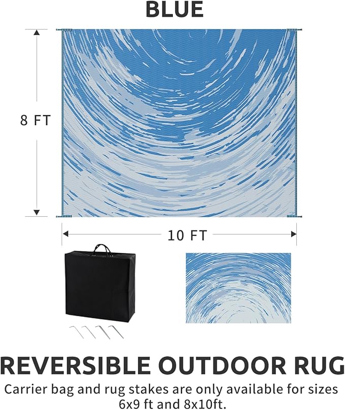 • RV traval&Camping: This camper must haves outdoor rug is ideal for picnics, gatherings, and RV trips! The lightweight outdoor camping carpet with foldable lines is easy to carry and saves space. Includes an extra carry bag and rug stakes for 6x9 ft, 8x10 ft and 9x12 ft. Grass-friendly, durable, and easy to clean, this outdoor rug enhances outdoor adventures.