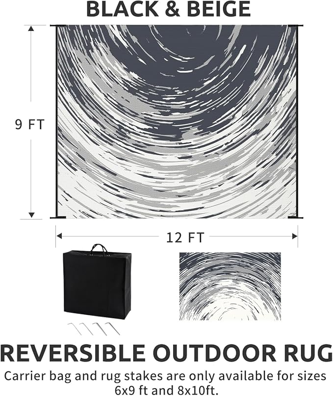 • RV traval&Camping: This camper must haves outdoor rug is ideal for picnics, gatherings, and RV trips! The lightweight outdoor camping carpet with foldable lines is easy to carry and saves space. Includes an extra carry bag and rug stakes for 6x9 ft, 8x10 ft and 9x12 ft. Grass-friendly, durable, and easy to clean, this outdoor rug enhances outdoor adventures.