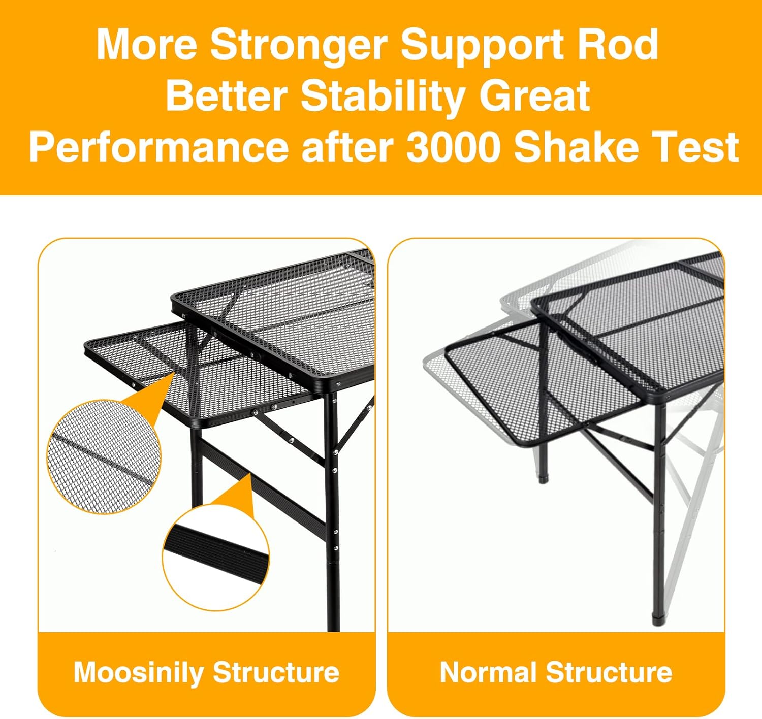 - Heat & Waterproof TOP - Moosinily portable grill table, with 1.6mm steel mesh top covered by powder painting, perform well no matter in heat or in water. The eage of the steel mesh has been polished so it would not be sharp for hands. The thicker 1050A aluminum alloy frame with diameter 25mm is lightweight, anti-corrosion and rust resistant which can use for most outdoor scenes in several year. Thickened Support Rods and the tabletop support rod keep the table stable, this folding camping table has a load capacity of 100 lbs and the table extension board has a load capacity of 30 lbs (evenly distributed)