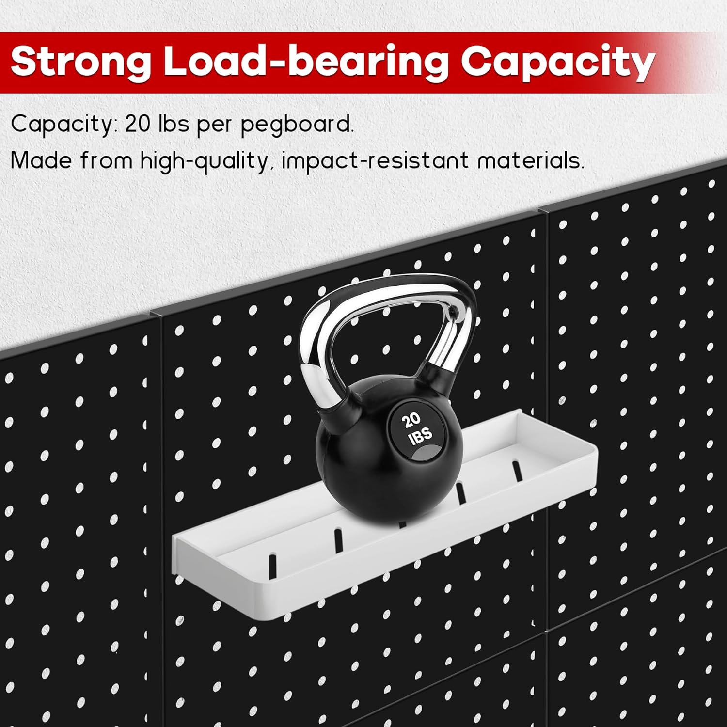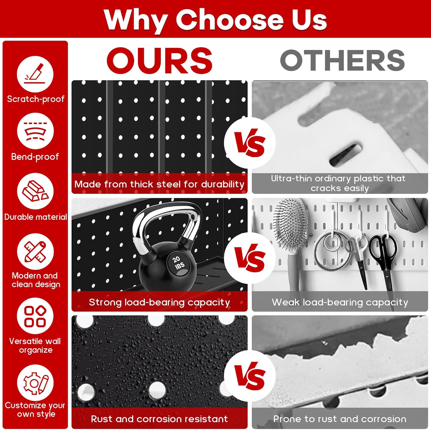 - 【Premium Materials】All-metal pegboard panels are crafted from top-grade heavy-duty steel, providing outstanding load-bearing capacity and durability. They are resistant to damage and wear, ensuring your tools organized and secure, and the pegboard panels without bending or warping for years to come. The pegboard comes with a scratch-resistant black galvanized surface finish that's easy to clean, providing extra protection against rust and corrosion.