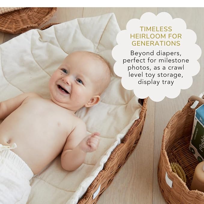 - VEGAN LEATHER CHANGING MAT- is the ultimate solution for hassle free diaper changes. With its wipeable and water-resistant surface, you can change your baby’s diaper in the wicker changing basket or pack it into your diaper bag and you're set for the most stylish diaper change on the move