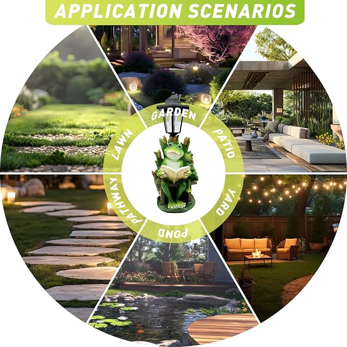 - 【AUTO CHARGE & LIGHT UP】 Please ensure the switch is "ON" before use and place the frog in the sun. It only takes 6-8 hours to charge fully. It will automatically light up in the evening, and the working time is more than 12 hours, enough to illuminate the charm of the whole night. This energy-efficient outdoor frog statue requires no wiring or batteries, making it a sustainable and hassle-free choice for your garden or patio