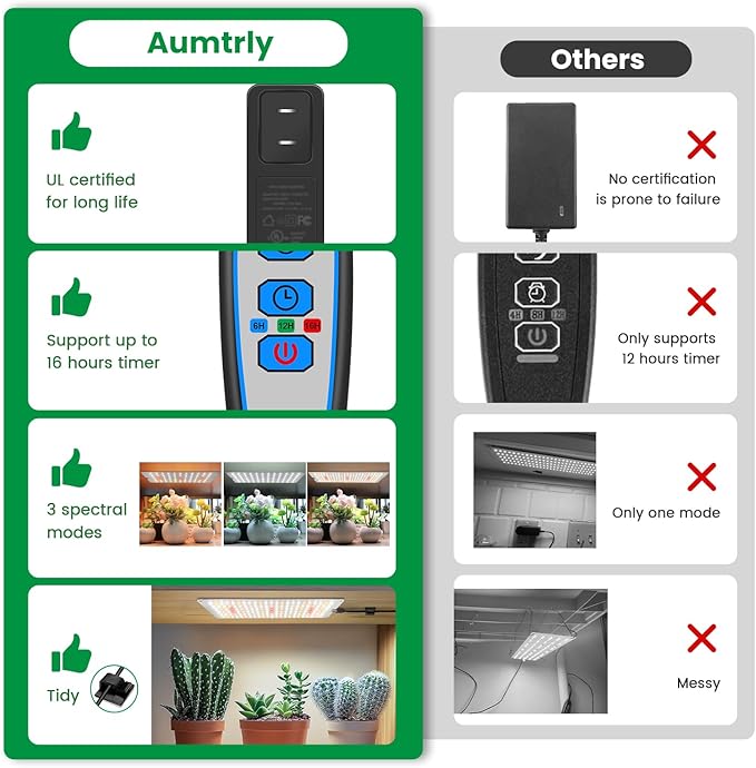 - Grow Light with Timer: Indoor plants often need more abundant and lasting sunlight, so we upgraded the timing option to 16 hours to provide plants with an uninterrupted light cycle; And adopted a UL certified adapter to ensure stable voltage output and longer use life.