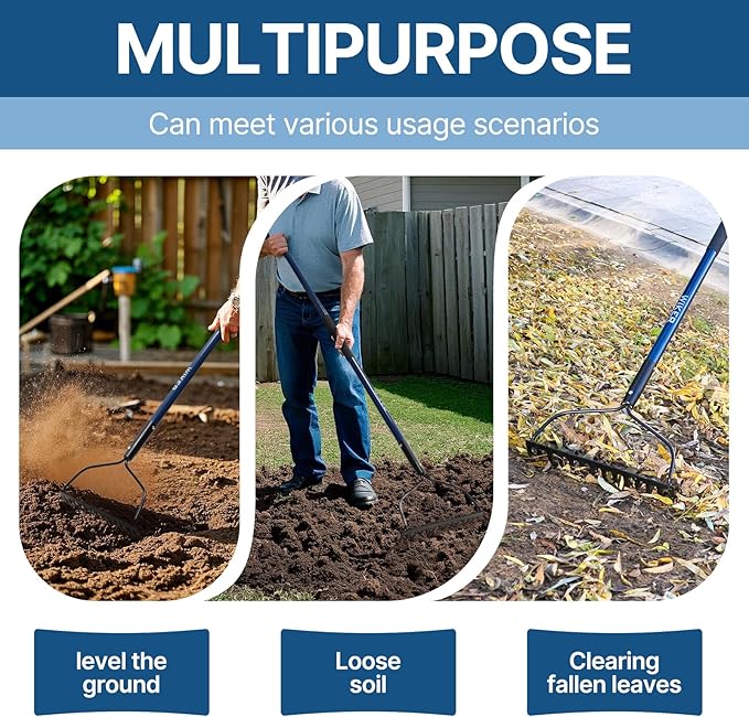 - Multi Purpos:Garden rake built to take on the toughest jobs.It’s been extremely useful in cleaning out and spring-prepping the flower beds,it allowed you to scoop up the dead leaves and other debris while at the same time scraping into the underlying dirt,prepping the surface for upcoming leveling,mulching,and planting annuals.This is one of those gardening tools that will last a lifetime.