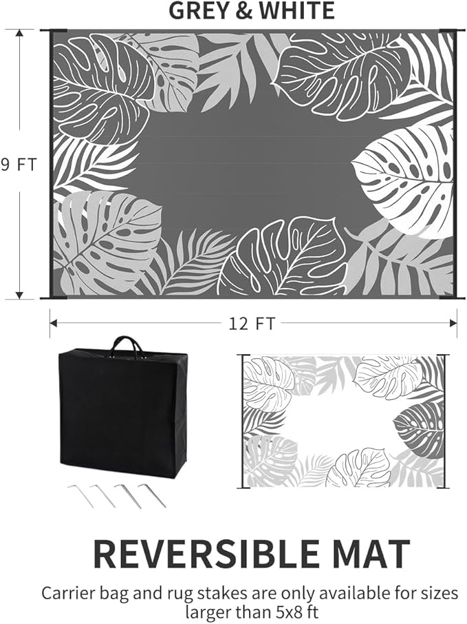 - RV traval&Camping: This camper must haves outdoor rug is ideal for picnics, gatherings, and RV trips! The lightweight outdoor camping carpet with foldable lines is easy to carry and saves space. Includes an extra carry bag and rug stakes for 6x9 ft, 8x10 ft and 9x12 ft. Grass-friendly, durable, and easy to clean, this outdoor rug enhances outdoor adventures.