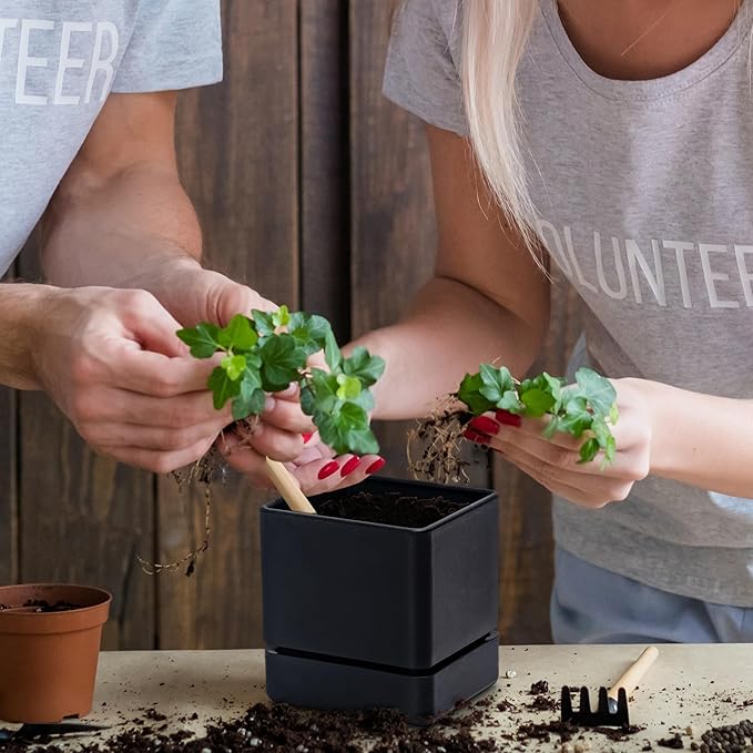 4 Inch Herb Planter Pot, Plastic Planter with Drainage Holes and Saucer, Modern Decorative Gardening Pot for Indoor Plants, Flowers, Herbs, Succulents, Black, Set of 4, 76-Y-B-4