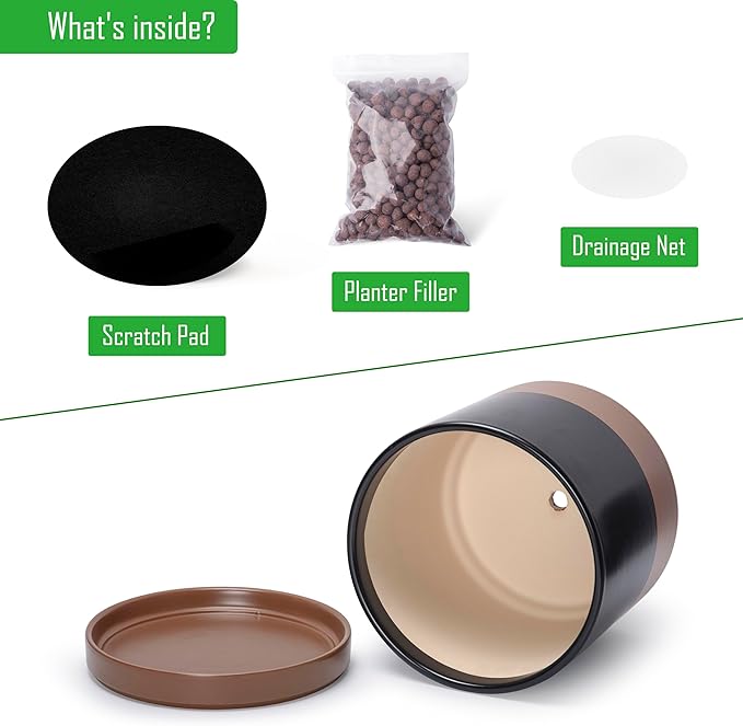 - Planter pot with drainage hole, mesh drainage net and protective scratch pad included.