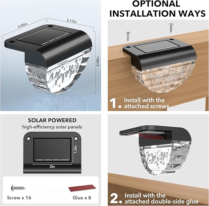 - 【Easy Installation】No wires required, Comes with the screws and glues, two installation methods for you to choose. You can use the screws or glues install(Will not leave a hole on your deck) , place it vertically or lay down flat along any edge of the stair, deck, fence, steps.