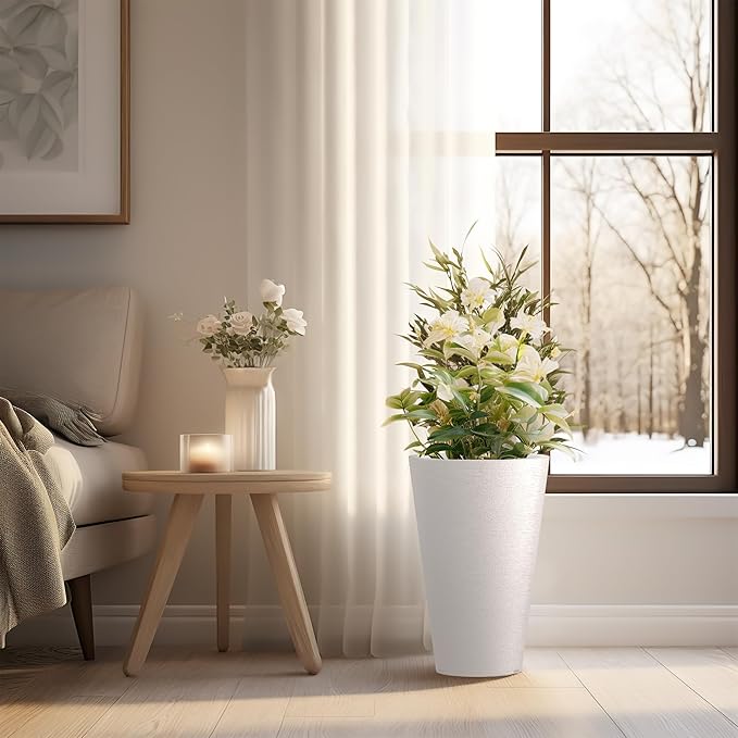 - Premium Tall Planters - Meticulously crafted with durable construction and superior workmanship, our planters are made from high-quality plastic, ensuring longevity, weather-resistance, and color retention. Whether utilized indoors or outdoors, these tall round planters are suitable for all seasons.