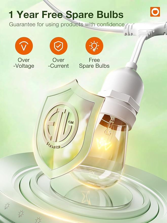 - Smart Installation: Each socket has hanging hook above, makes it easy for hanging with hooks, guide wires, or zip ties. It can connect with another simply use grounded cord plugs into any standard outlets. Link up to 2 strands