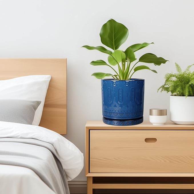 Ceramic Planter - 8 Inch Plant Pot Indoor with Drainage Holes and Saucer Round Planter Outdoor Mid-Century Modern Flower Pot Succulent Pot for Home Decor Blue