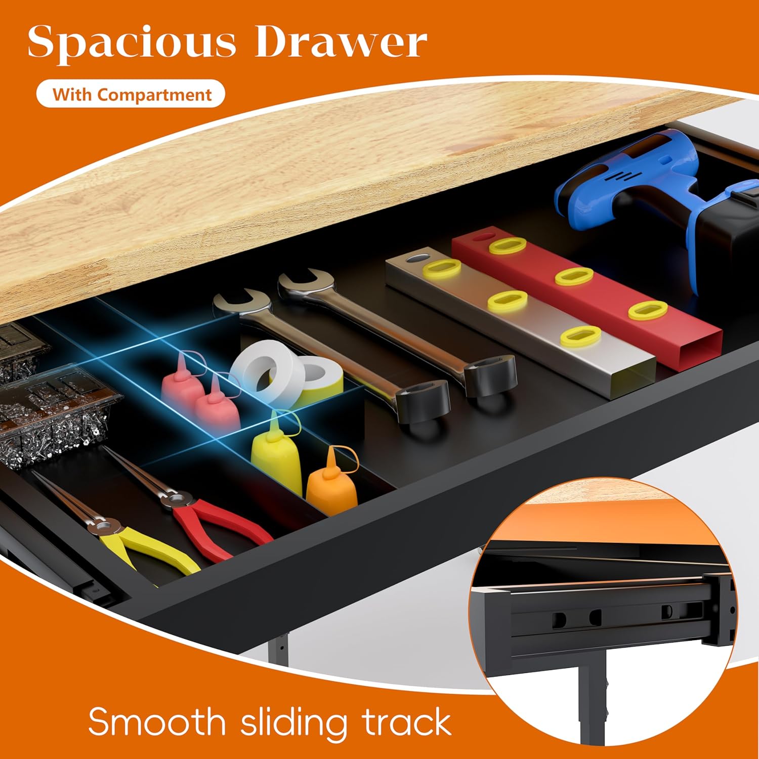 - Heavy Duty Workbench with Drawer: Features a 2" deep drawer with high-quality smooth slides supporting up to 100 lbs. Spacious enough for screwdrivers, wrenches, and small power tools. Includes a removable iron compartment, placeable on the left or right side for flexible storage