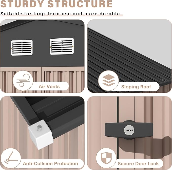 - SLOPED ROOF & LOCKABLE DOOR & AIR VENTS - The sloped roof is designed to let rainwater flow out quickly. The lockable doors can enhance security and prevent strangers or small animals from entering accidentally. The design of air vents can effectively improve air circulation and prevent your items from getting moldy and damaged in humid and hot summers. Plastic protective caps are provided for the sharp corners of the ceiling and each screw to prevent injuries during construction or use