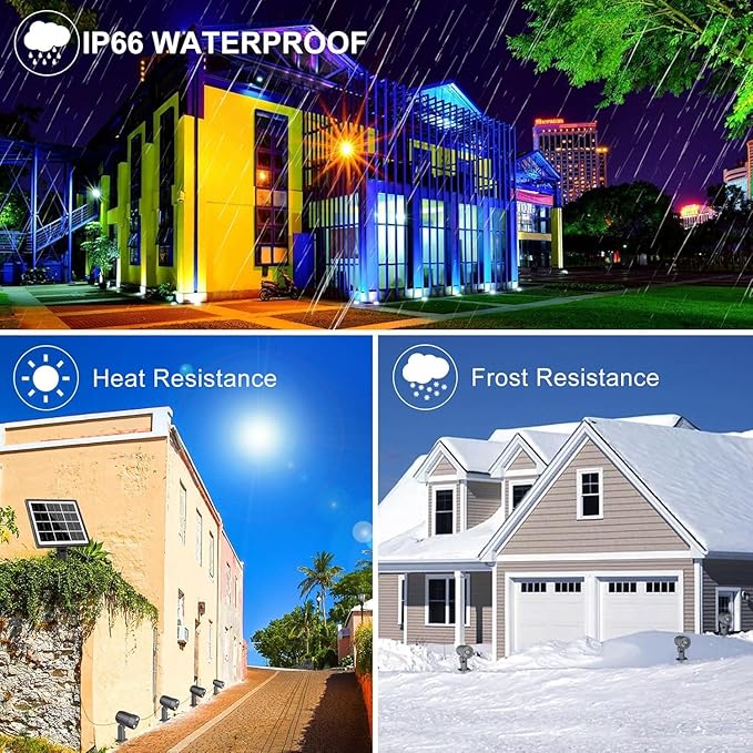 - Sturdy & IP66 Waterproof Garden Solar Light: IP66 waterproof can withstand rainy days, perfect as an outdoor light solar powered. The weatherproof housing keeps the solar rgb landscape spotlights protected from moisture and dust, stable and long-lasting. High temperature resistance and cold resistance -25 °C - 55 °C
