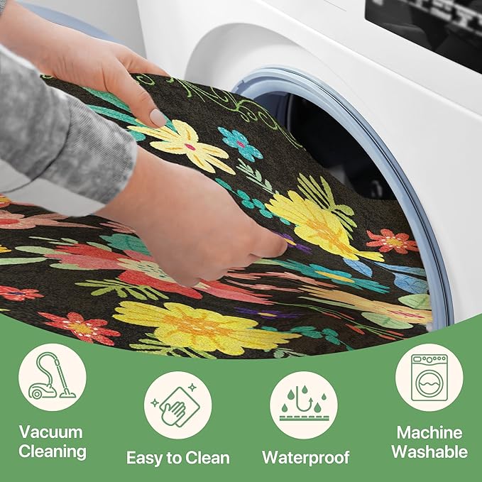 GENIMO Indoor Outdoor Area Rug 5' X 7' Waterproof, Washable Patio Rug Non Shedding, Easy Cleaning Floral Outdoor Carpet for Living Room, Bedroom, Dining Room, Balcony, Backyard, Deck, RV, Black