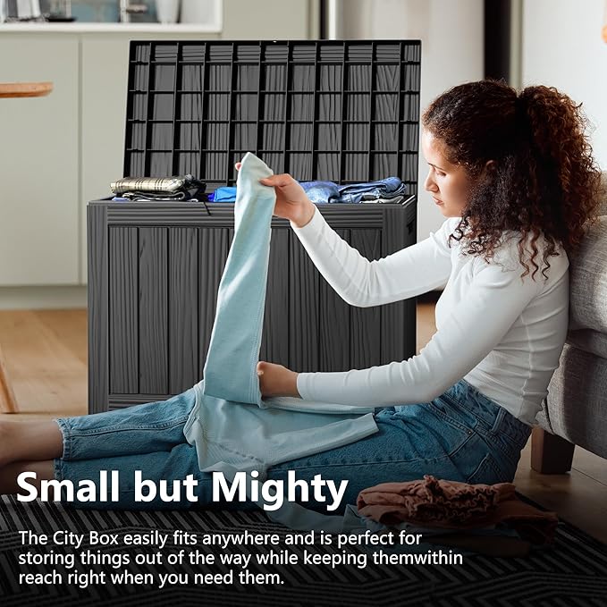 - 𝐃𝐮𝐫𝐚𝐛𝐥𝐞 𝐌𝐚𝐭𝐞𝐫𝐢𝐚𝐥 - Made from high-quality resin material, this deck box provides unyielding protection for your belongings. With up to 1000 SGS UV protection, your outdoor storage box will never warp, fade, or crack. It withstands harsh weather, intense sunlight, and cold climates. Whether it's the sun-drenched summer or the stormy winter, your items will be safely stored, remaining in pristine condition.