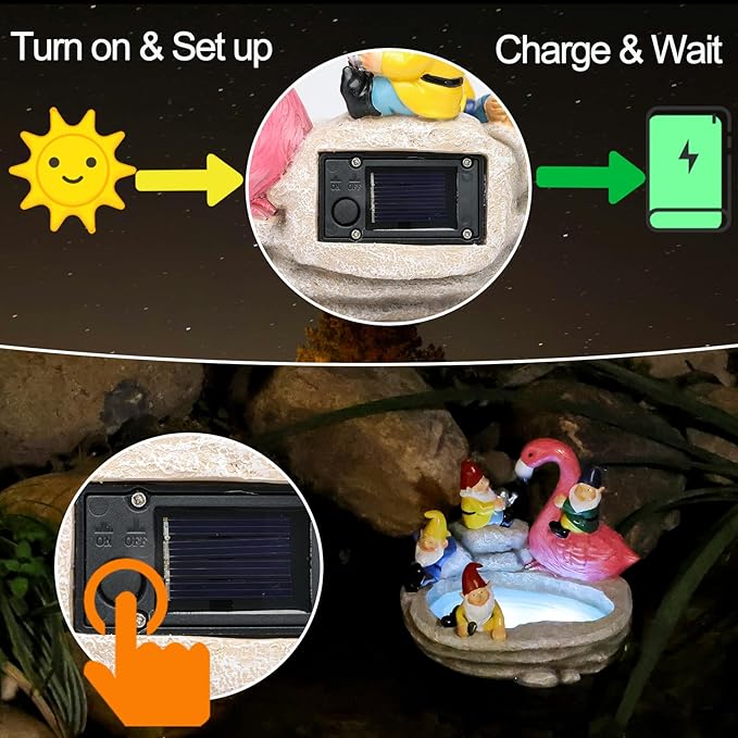 - 【AUTO-ON SOLAR DECORATION】This gnome riding flamingo statue is very easy to install and use. simply turn on the switch and place it under the sunlight and let the solar panel will charge within 5-8 hours during the day and light up automatically at night for 8-10 hours