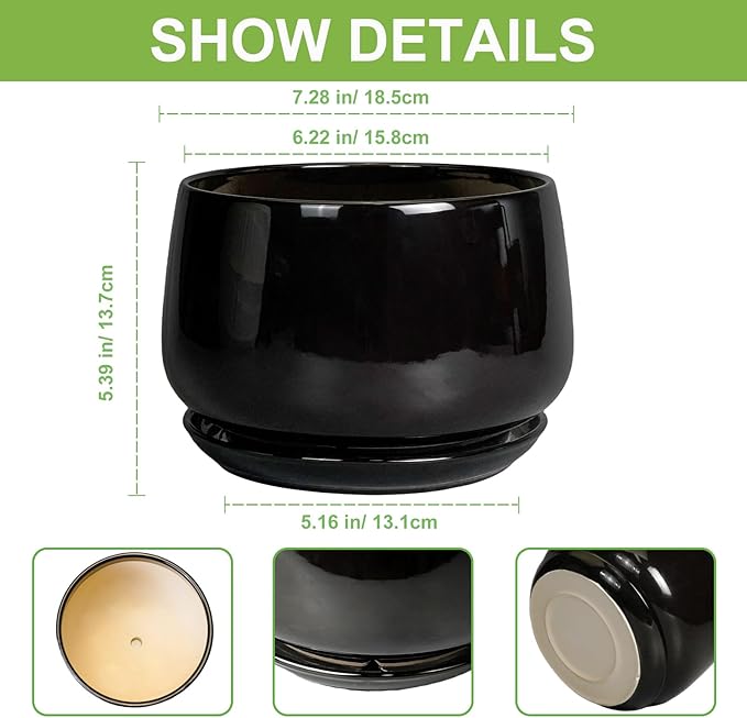 - Dimensions: These ceramic planters pit measures 7.28" x 7.28" x 5.39". Balck planter is an ideal choice for growing bonsai tree, snake plant, money tree, succulents, cacti, aloe vera, orchids, african violet, geranium plant, peace lily, monstera deliciosa and other indoor & outdoor plants