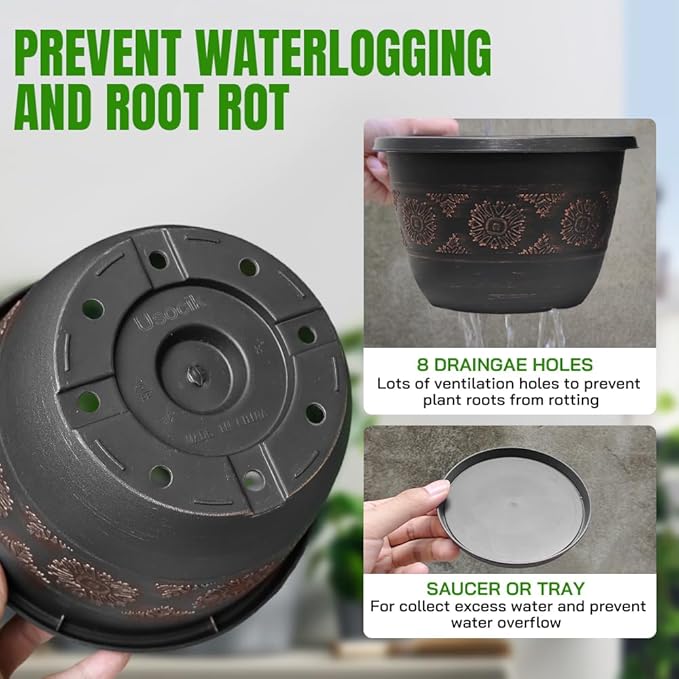 - DRAINAGE HOLE WITH SAUCER – Each garden pot has drainage holes and a saucer. The holes of these plant pots helps protect plants from excess watering. The saucer help to collect excess water and prevent water flowing, keeping the floor dry and clean.