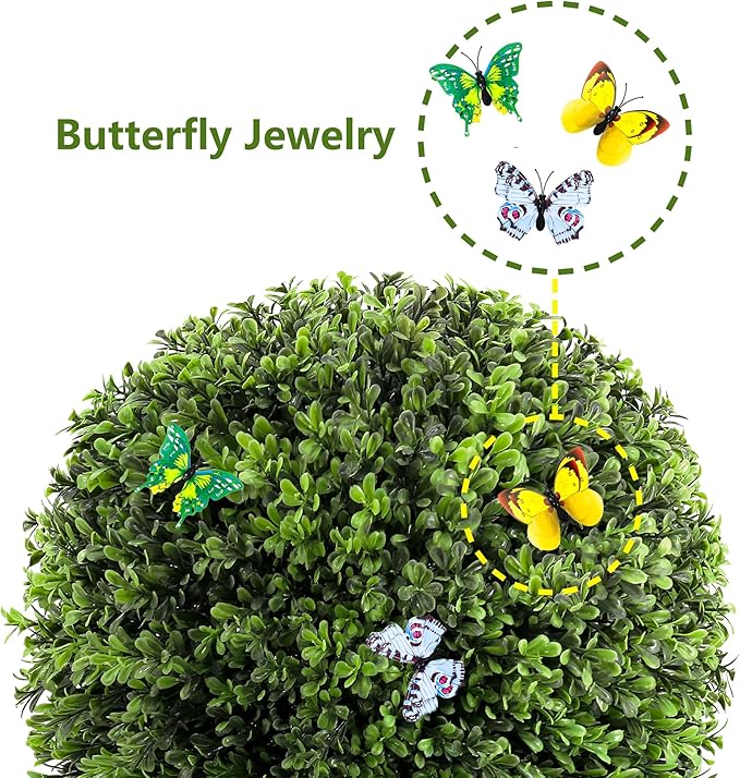 • 【90-Second Setup & Versatile Styling】 Pre-assembled structure with bendable vines and embedded ground spike allows instant installation in soil, pots, or rocky terrain. Rotate 360° to showcase fake butterfly ornaments from every angle – Our evergreen faux boxwood balls is perfect for photo-ready porch décor or events