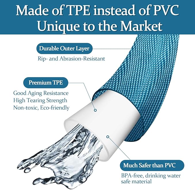 - [ All-Weather Flexibility ] Maintains flexibility down to -22 degrees Fahrenheit and can be used in temperatures up to 150 degrees Fahrenheit. Ordinary PVC hose has poor-resistance to low and high temperatures, and the hose loses performance under temperature changes, which can damage it. TPE's superior freeze-resistance provides durability to the hose.